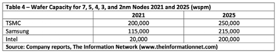台积电和三星在<7nm 节点生产领先主要是因为英特尔起步较晚。根据表 5,5 年后情况将发生变化,英特尔将成为强大的竞争对手。当然,台积电仍将是领先供应商。