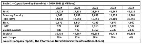 表1显示了2019年至2023年间领先代工厂的资本支出。继2019年以来两位数的同比增长之后,2022年资本支出预计增长44%。