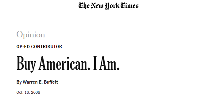 当市场一片悲观时,巴菲特于2008 年 10 月在《纽约时报》发表了那篇著名的文章:《我在买入美国》。
