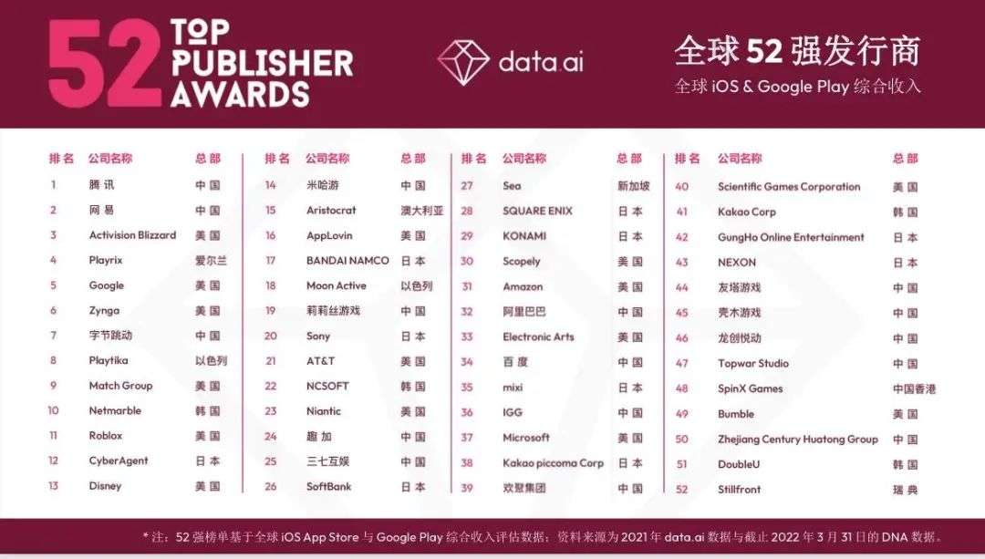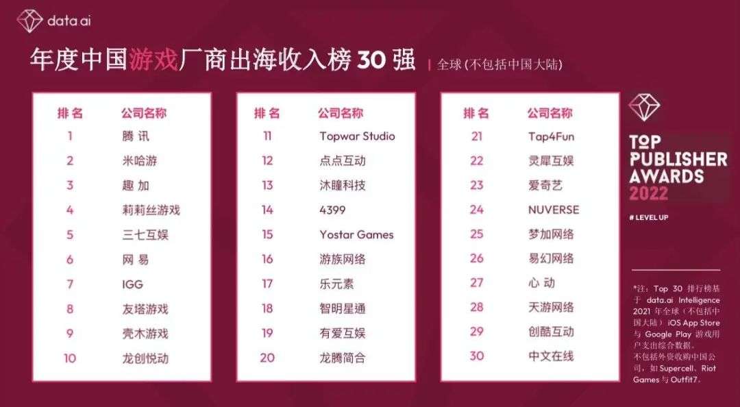 昨日(4月12日),data.ai公布了4个维度的榜单介绍,分别是全球发行商52强、游戏出海发行商排行榜、年度中国非游戏厂商出海收入榜 30 强及年度中国游戏厂商出海收入飞跃榜 30 强。