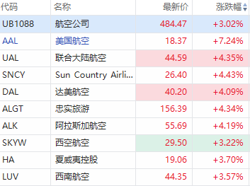 航空股集体上扬。达美航空涨超4%,Q1营收超预期。受利好消息影响,航空股跟涨,美国航空涨7%,联合大陆航空涨超4%。