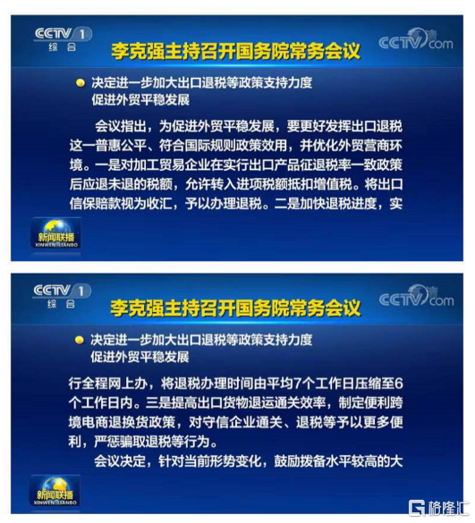 进一步加大出口退税等政策支持力度,促进外贸平稳发展。会议指出,为促进外贸平稳发展,要更好发挥出口退税这一普惠公平、符合国际规则政策效用,并优化外贸营商环境。一是对加工贸易企业在实行出口产品征退税率一致政策后应退未退的税额,允许转入进项税额抵扣增值税。将出口信保赔款视为收汇,予以办理退税。二是加快退税进度,实行全程网上办,将退税办理时间由平均7个工作日压缩至6个工作日内。三是提高出口货物退运通关效率,制定便利跨境电商退换货政策,对守信企业通关、退税等予以更多便利,严惩骗取退税等行为。