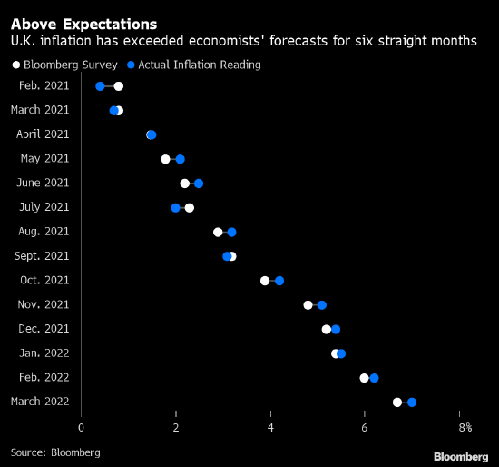英国公布的3月份通胀数据再次令人震惊后,经济学家争先恐后地上调通胀预期,许多人预计最快下个月通胀率就可能接近9%。