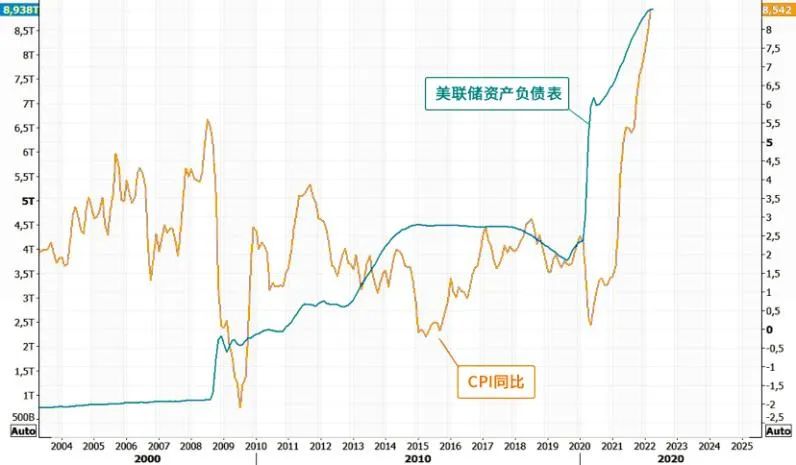 自从2020年放水以来,美国CPI走势和美联储资产负债表走势出奇一致。