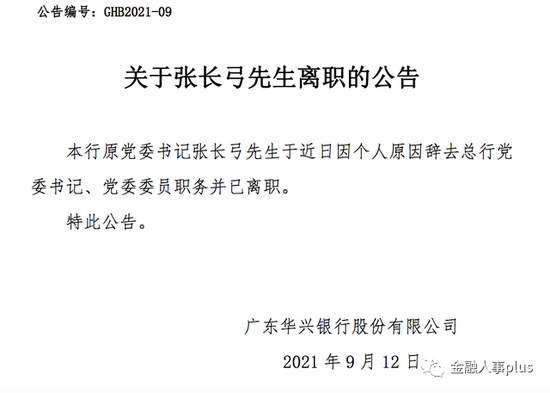 2021年9月12日,广东华兴银行发布公告称,张长弓于近日因个人原因辞去总行党委书记、党委委员职务并已离职。2019年10月,广东华兴银行官宣张长弓出任该行党委书记,官网的高管介绍中位于董事长之下行长之上。