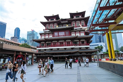 图为4月14日,午休的人们走在新加坡牛车水的街道上。 新华社/法新