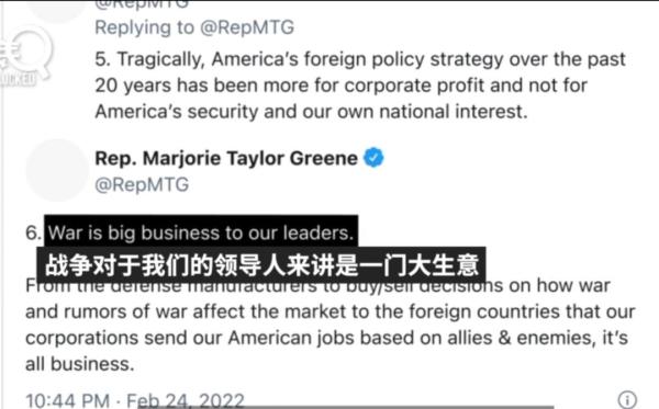 共和党代表玛乔丽·泰勒·格林在俄乌冲突发生两天前,购买了价值1000美元至15000美元范围的洛克希德·马丁公司股票。