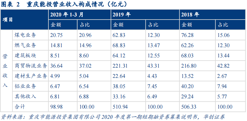 公司经营业务由煤电、燃气、建筑、商贸物流、建材生产、铝业六大板块构成。2019年公司煤炭产量1,007.17万吨,形成了渝、黔、滇、疆“三省一市、十三片区”的发展格局;天然气供应总量达37.03亿立方米,发电量118.94亿千瓦时。截至2020年3月,燃气供应范围覆盖26个区县和开发区,管理服务用户突破495万户;电力权益装机容量达493.43万千瓦。