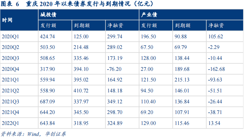 2021年以来重庆城投债发行额与净融资不断上升。2020年、2021年及2022Q1的城投债发行额分别为1754.79亿元、2450.13亿元及643.84亿元,单季度发行额整体呈上升趋势,2022Q1同比增长率超过14%。2021年以来,重庆单季度城投债净融资持续为正。按照华创城投口径,重庆市125家存量城投平台存量城投债合计6079.91亿元。