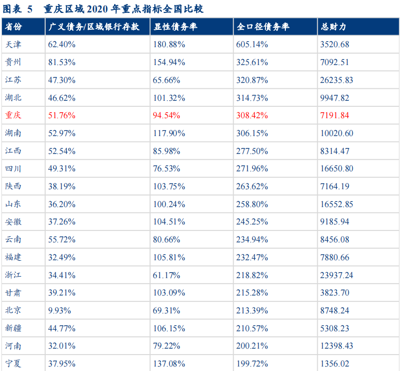 重庆地区的债务率略偏高,各项指标对比其他省份表现尚可。从重庆地区的经济、财政、债务基本面来看,其总财力位列全国第17,全口径债务率308.42%位列全国第5,显性债务率位列全国第19。以广义债务/区域银行存款判断相较于金融资源的债务扩张程度,其排名为全国第6。