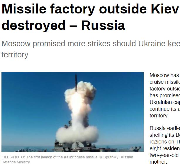 国防部发言人伊戈尔·科纳申科夫少将周五表示,一艘俄罗斯军舰使用“口径”导弹对基辅郊区一军工厂实施打击。