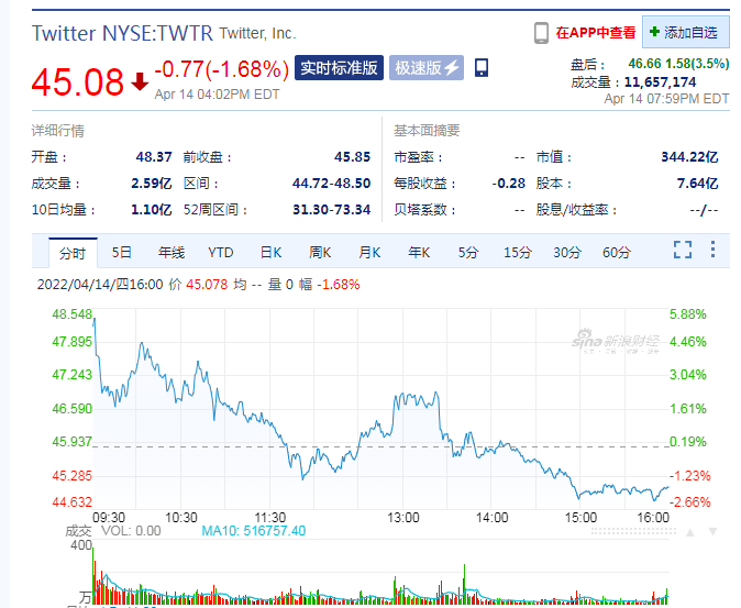 截至4月14日,推特收跌1.68%,报45.08美元/股。