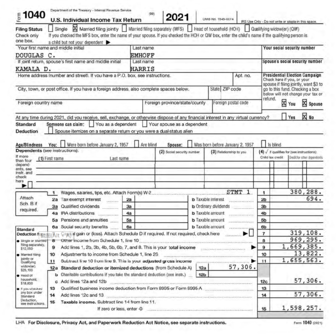 与此同时,美国副总统卡玛拉·哈里斯(Kamala Harris)和她的丈夫道格拉斯·埃姆霍夫(Douglas Emhoff)也公布了他们的纳税申报表,申报表显示他们在2021年的收入为170万美元,与2020年的收入相近,除了部分来自薪资外,还有大量其他收入。去年他们缴纳了523371美元的联邦所得税,税率为31.6%。