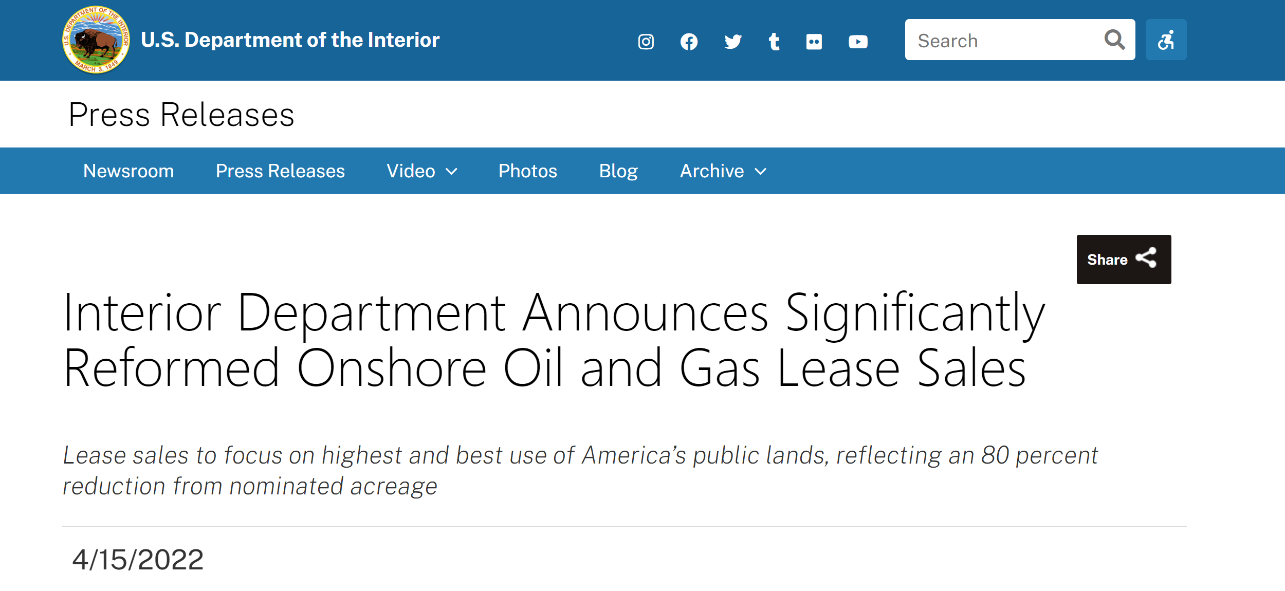 美国内政部(United States Department of the Interior)表示,由于强有力的环境审查、与部落和社区的接触以及优先考虑美国人民在公共土地上的广泛利益,这次将在大约 144,000英亩的土地上提供大约173个地块,与禁令前的审批规模相比,土地面积减少了80%。