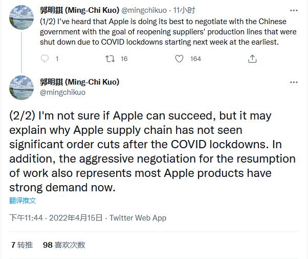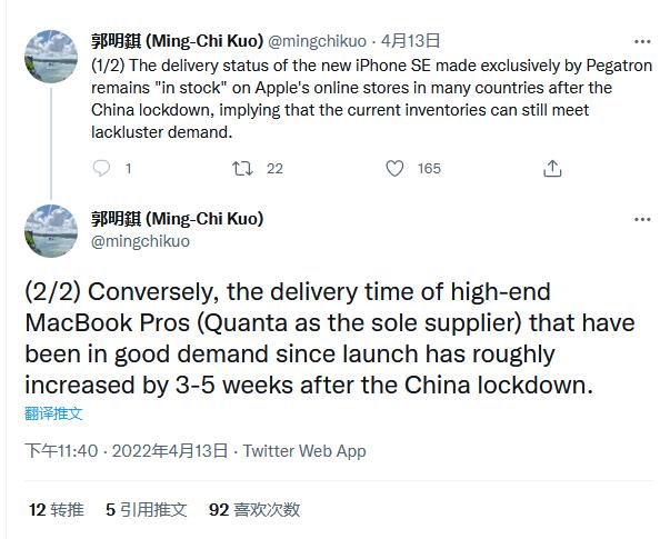 受本次疫情影响,富士康、和硕等多家苹果供应商应防疫管控要求暂停了制造业务,广达电脑本周早些时候关闭了其在上海的业务,该公司生产苹果公司四分之三的MacBook。路透社周五报道,在评估封控状况后,分析师认为如果这些措施持续下去,苹果产品的供应将面临问题。