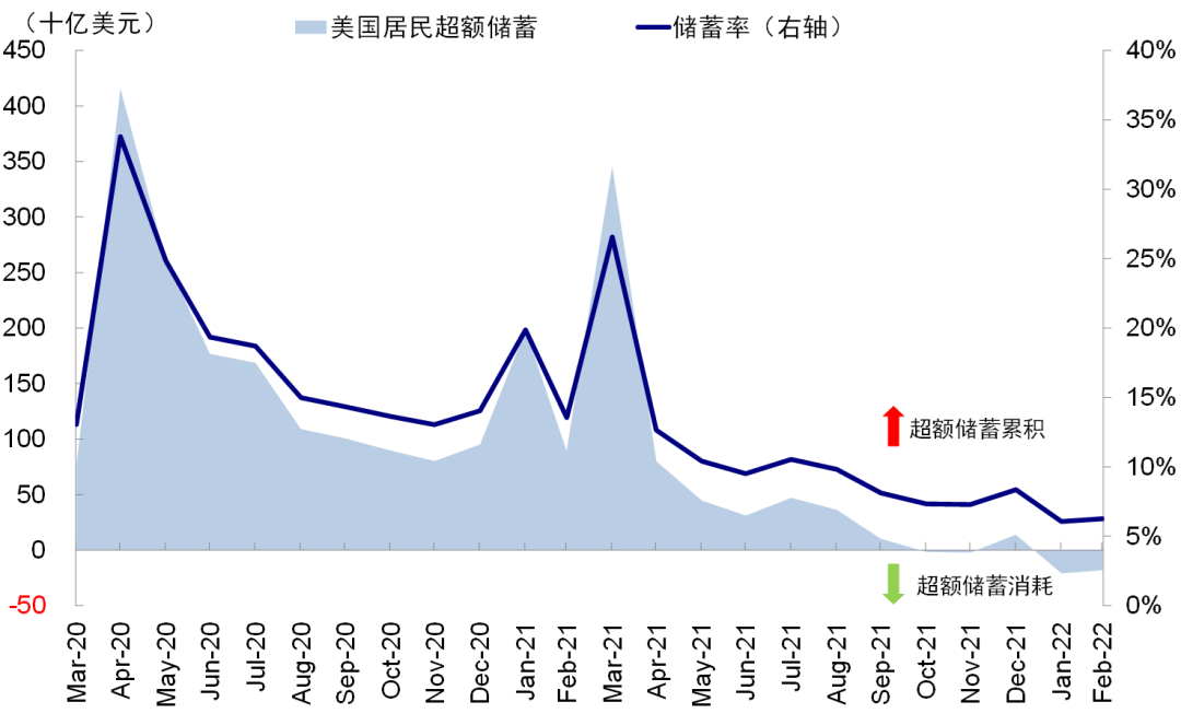图表:我们测算1月和2月美国居民超额储蓄已经有389.2亿美元的支取,但仍留存有2.43万亿美元