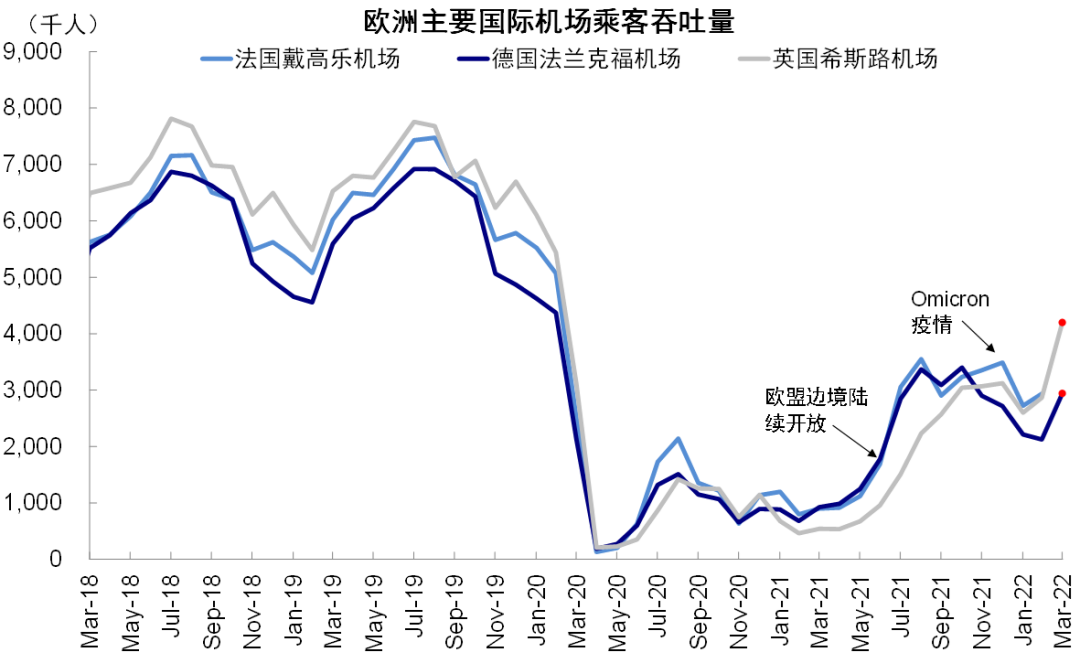 1)欧洲如法国酒店业2月旅客人数重新上升,去掉季节性因素和基数影响后,2月较1月进一步改善(对比2019年CAGR增速从-10%回升至-5.0%)。从修复水平看,2月法国住店游客总数和2019年同期相比相差14.2%,主要受海外客源未完全修复拖累(低于疫情前36.2%),而本地游客仅差6.8%。此外,欧洲机场乘客吞吐量达疫情以来新高。英国希斯罗机场和德国法兰克福机场3月乘客吞吐量分别为419.7和294.1万人次,环比增长46.6%和38.6%,但较2019年同期仍有差距(分别低-35.7%和-47.4%)。