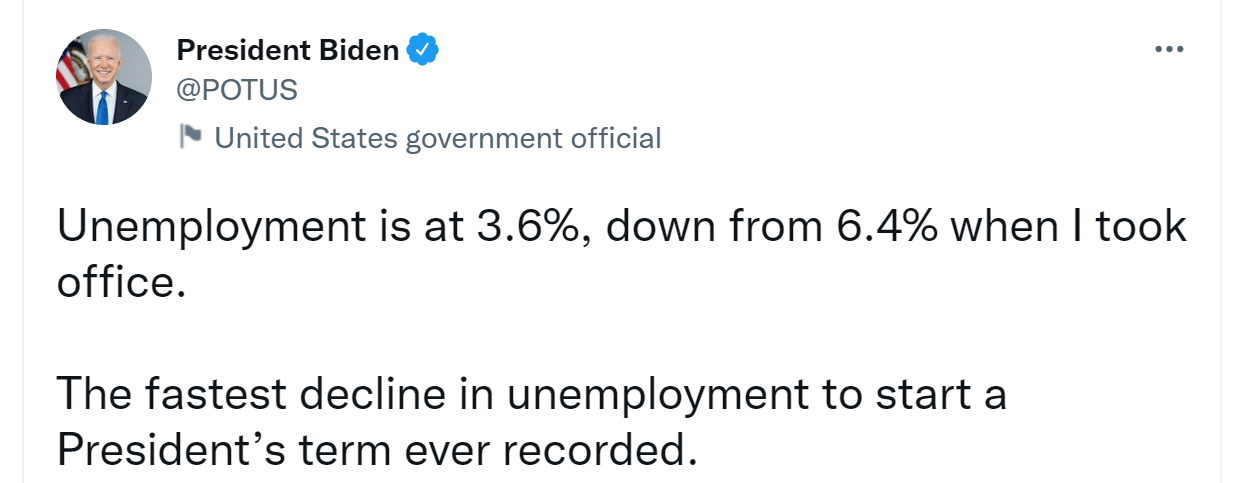 【环球网报道】当地时间16日,美国总统拜登发推称:“失业率从我上任时的6.4%降至3.6%,这是任何一届总统开始其任期之后,失业率的最快降速。”