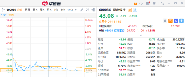 4月18日上午,招商银行一度大跌近9%,罕见的大跌使得该股一度冲上微博热搜,引发不小热议。