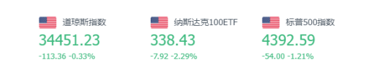 上一交易日美股三大股指集体收跌,道指 $DJI 跌113.36点,跌幅为0.33%,报34451.23点;纳指 $IXIC 跌292.51点,跌幅为2.14%,报13351.08点;标普500指数 $SPX 跌54.00点,跌幅为1.21%,报4392.59点。