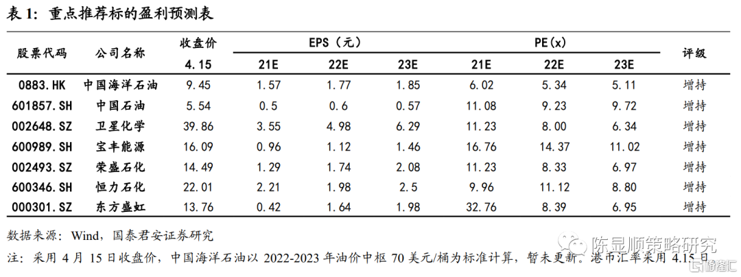 2.2. 石化:预计油气价格中枢抬升,重点推荐低估值最上游