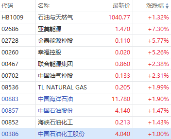 国际油价攀升,带动“三桶油”逆市走强,中海油(00883)涨1.9%,中石油(00857)涨1.47%,中石化(00386)涨1%。