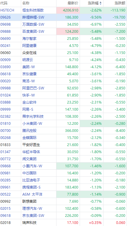 成分股中,哔哩哔哩跌超9%,万国数据跌近7%,百度跌超5%,美团跌超4%,阿里、快手跌近3%,腾讯跌超2%。