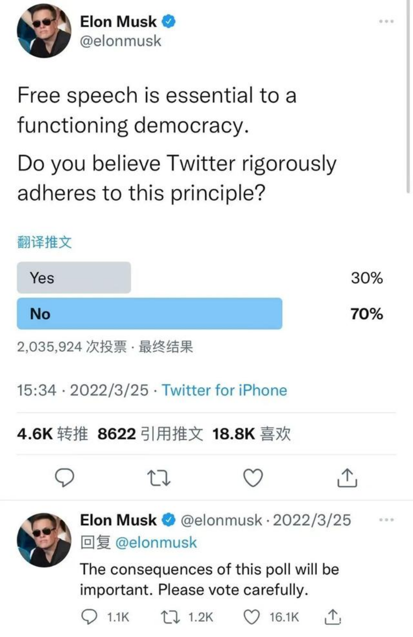 3月25日,马斯克曾发布投票,称Twitter应该公布核心算法。该投票获得82.7%的赞同。同日,他发布了另一项投票,内容是“你觉得推特有遵守言论自由(Free Speech)的原则吗?”他同时还提醒到“这个投票相当重要。请小心投下你的一票。”结果有200多万的网友参与了这一投票,并且有70.4%的人认为Twitter没有遵守这一原则。