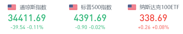 周一美股三大股指小幅收跌,道指 $DJI 跌39.54点,跌幅为0.11%,报34411.69点;纳指 $IXIC 跌18.72点,跌幅为0.14%,报13332.36点;标普500指数 $SPX 跌0.90点,跌幅为0.02%,报4391.69点。