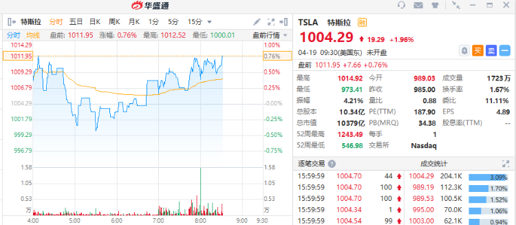 周一美股成交额冠军特斯拉收高1.96%,成交169.3亿美元。