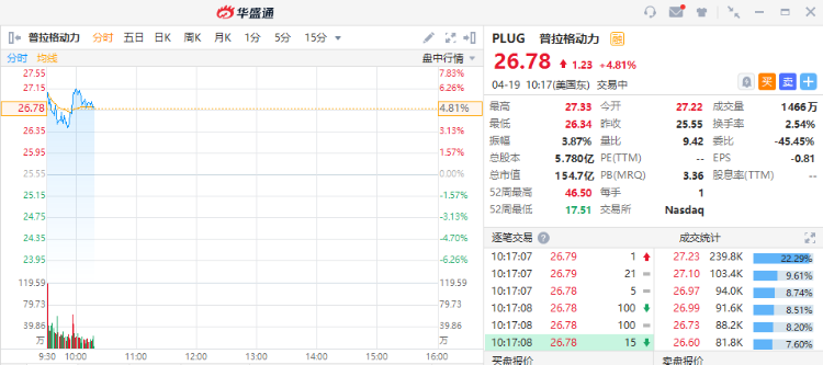 智通财经APP获悉,4月19日美股盘初,截至发稿,普拉格能源(PLUG)涨4.81%,报27.045美元。消息面上,普拉格能源宣布与沃尔玛 (WMT)达成一项协议,普拉格能源每天将提供多达20吨液态绿色氢,为沃尔玛美国配送中心的搬运叉车提供动力。这也是普拉格能源首批绿色氢供应合同之一。