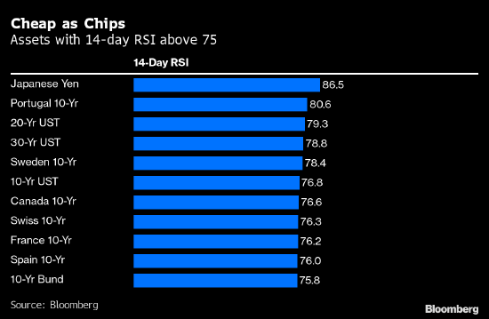 Mike Regan对相对强弱指标的描述令人难忘。他说,相对强弱指标作为一种技术指标如此简单,即使是金融记者也能理解。该指标对某些资产的适用性可能会好于另一些资产,不过,它的确在大多数情况下适用于大多数的资产。眼下,该指标发出的信号是,世界各地的债券--以及日元--都已超卖。这并不一定意味着它们会涨,但它很好地说明了收益率未来几天至少会盘整,未来几周甚至可能会下行。