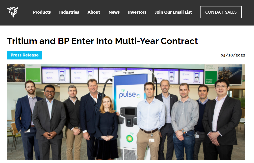 根据这份初始订单,Tritium将向英国石油在英国、澳大利亚和新西兰市场提供近1000台充电桩和相关服务,以支持英国石油的全球电动汽车充电网络。Tritium称,这项合同象征着两家公司之间的战略合作上升了一个阶梯。