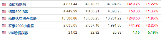 截至北京时间20日凌晨00:50,道琼斯指数涨1.22%,标普500指数涨1.33%,以科技股为主的纳斯达克综合指数涨1.86%,先前一度涨超2%。另外罗素2000小盘股指数涨超2%,显示投资者增加了对风险资产的押注。