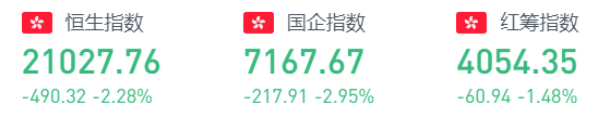 截至4月19日星期二收盘,港股全线下跌。恒生指数跌2.28%,报21027.76点;国企指数跌2.95%,红筹指数跌1.48%。恒生科技指数跌3.79%,哔哩哔哩跌10.92%,万国数据跌9.56%,百度跌5.33%,美团跌5.93%,阿里跌4.19%。