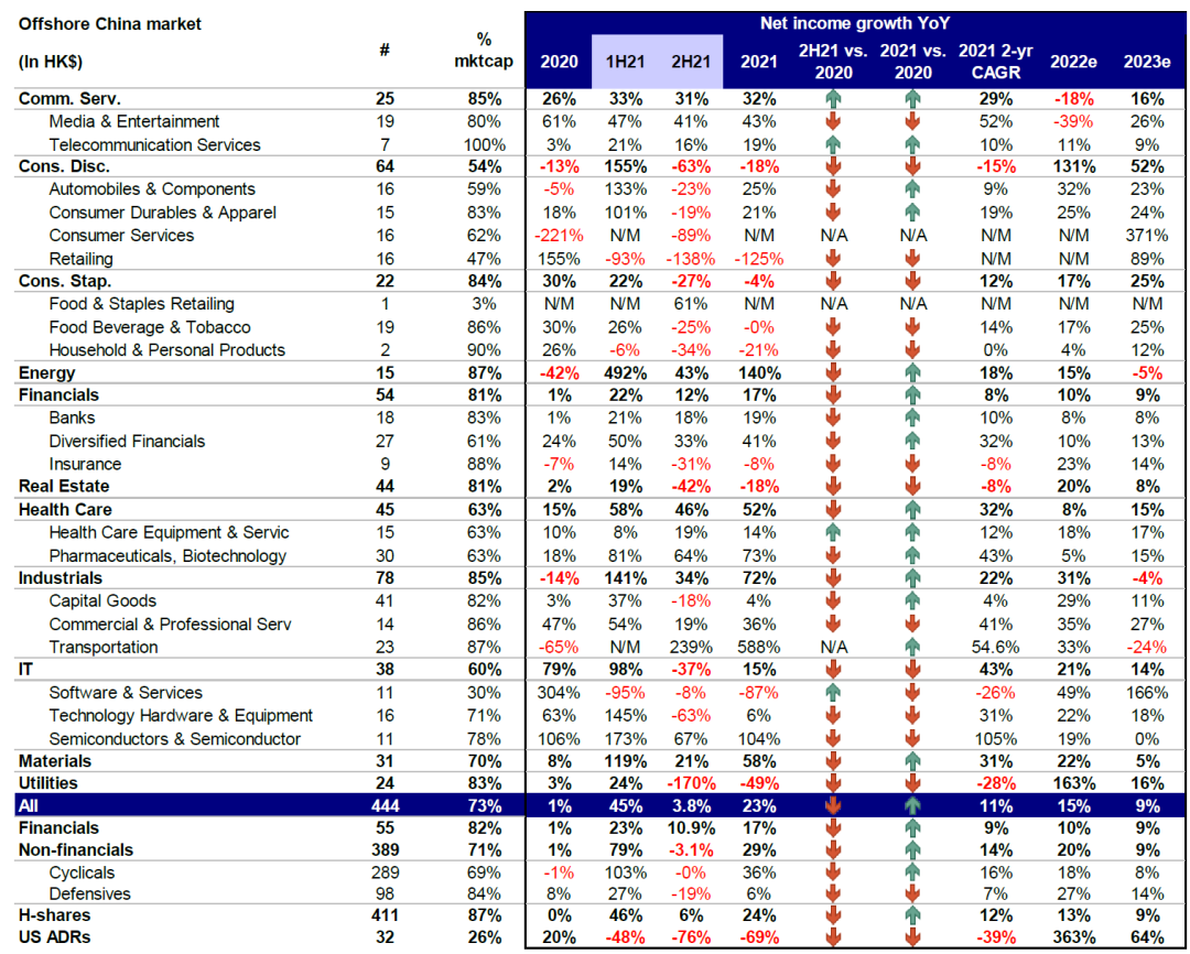 图表:我们预计2022年海外中资股整体盈利增长7.2%