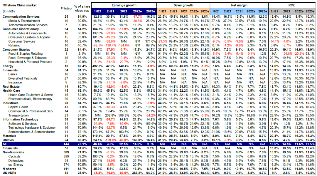 从自上而下的策略角度,我们预计2022年海外中资股整体盈利有望实现7.2%的增长,其中非金融板块增长8.6%,金融板块5.9%。我们上述预测主要基于的假设包括销售收入小幅增长6%(等价于名义GDP增长7.7%)、利润率小幅扩张至6.9%。后续政策扶持和监管变化是影响未来盈利前景的主要因素。
