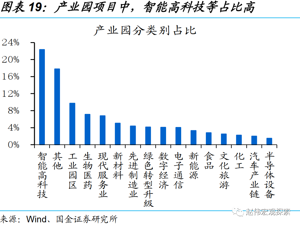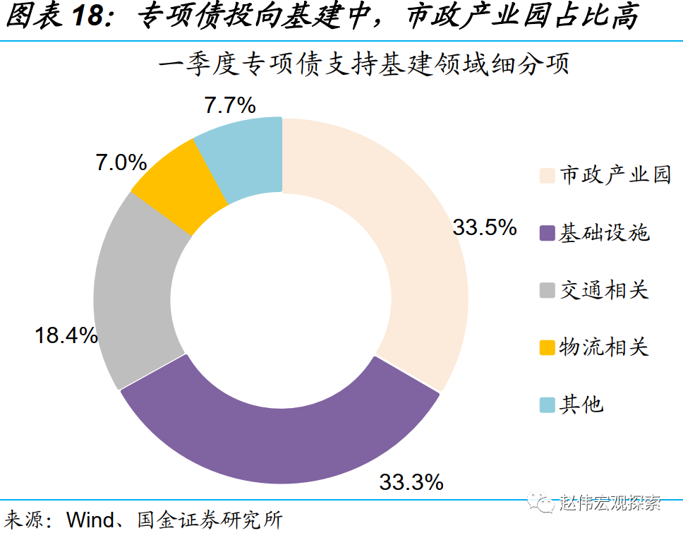 加强基建支持的同时,注重产业引导,兼顾短期需求对冲和中长期产业转型升级。一季度投向基建的专项债中,支持市政产业园建设的比例最高、33.5%。从产业园类型来看,智能高科技、生物医药、新材料、绿色转型、数字经济等为专项债重点支持领域,相关基建配套投资占比超七成,其中,智能高科技、生物医药等占比居前,分别达 22.4%和 7.1%,先进制造业和绿色转型升级领域也相对较高,分别为 4.4%和 4.2%。