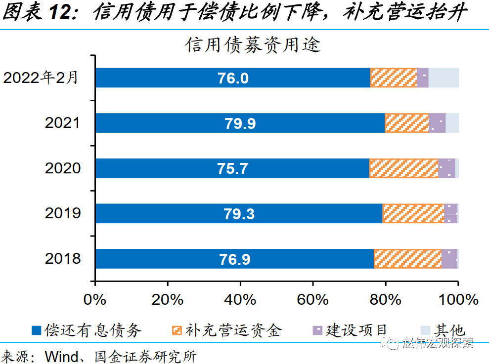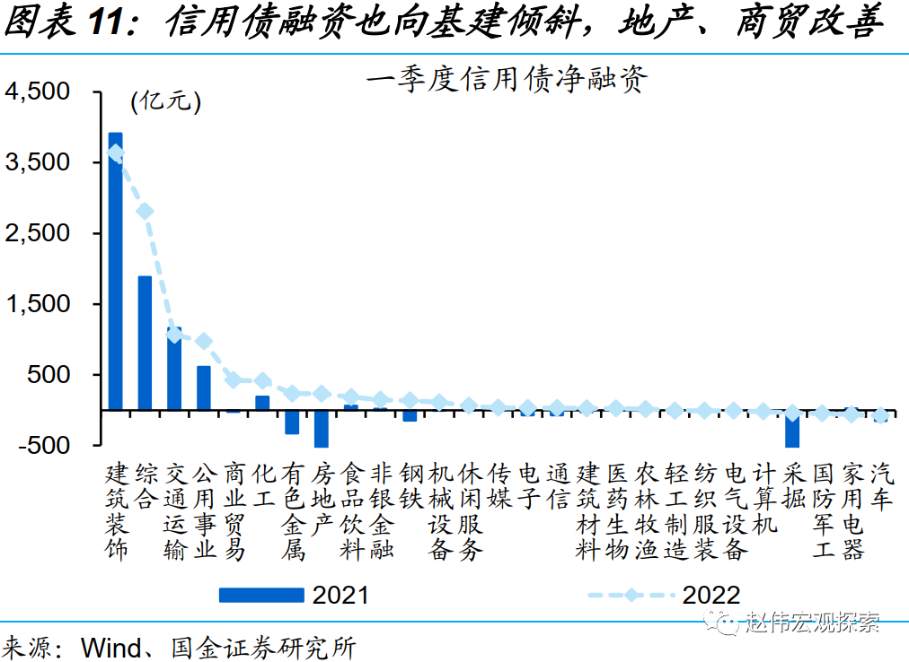 信用债融资也向基建领域倾斜,地产、商贸等行业融资改善,募资用于建设项目比例抬升。一季度7成以上行业的信用债融资为正,而2021年信用债融资为正的行业不足4成。分行业来看,建筑装饰、交通运输和公用事业等基建链行业融资居前,合计融资超5600亿元、占比近55%;地产、商贸、钢铁等行业信用债融资明显回暖、2021年同期均为负。从新发债券的募资用途来看,一季度用于偿还有息债务和建设项目的比重分别较2021年回落4个百分点和1个百分点,用于补充营运资金的比重抬升、0.7个百分点。