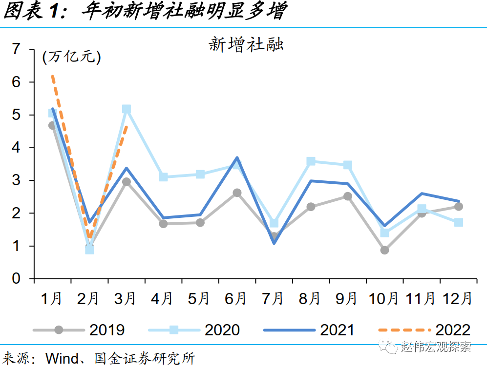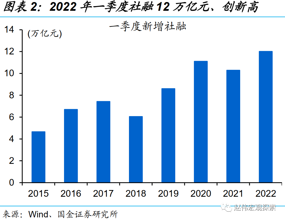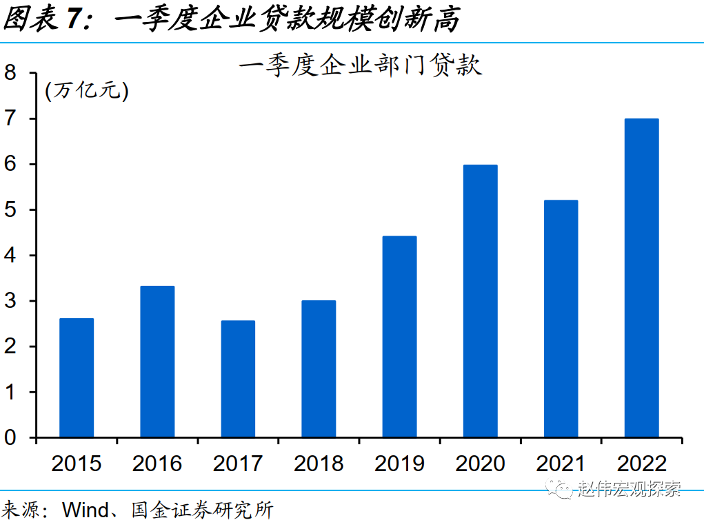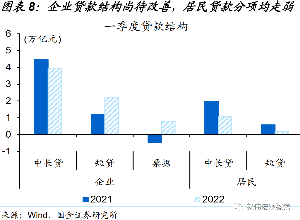 结构来看,政府债券发行前置,企业贷款创新高、结构尚待改善,居民长短贷纷纷走弱。一季度政府债券融资1.58万亿元、远高于2021年同期的0.66万亿元,主因专项债发行前置。贷款分项中,一季度企业贷款近7万亿元、主因短期贷款和票据融资冲量,而中长贷同比减少5200亿元左右;居民端贷款明显回落,中长贷、短贷同比纷纷减少,或与购房行为、消费活动走弱等因素有关。