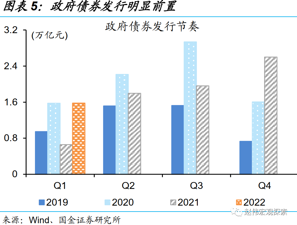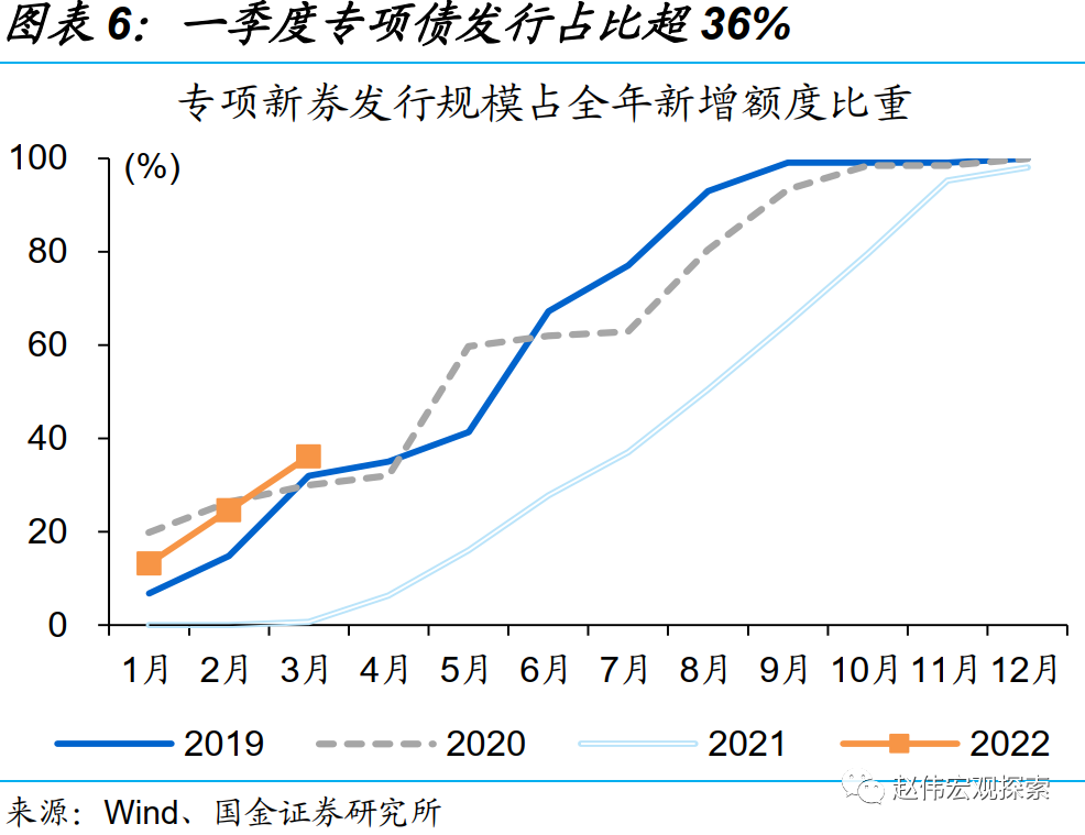 政府债券发行前置、一季度专项债发行占比超34%,提前批专项债额度几近用完。一季度政府债券融资1.58万亿元、远高于2021年同期的0.66万亿元,主因专项债发行前置。其中,一季度专项新券发行1.25万亿元、占新增专项债额度的34.3%,而近三年一季度发行平均占比均值为21%,2021年12月提前下达的新增专项债额度仅剩下14%左右。