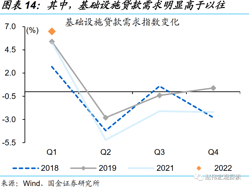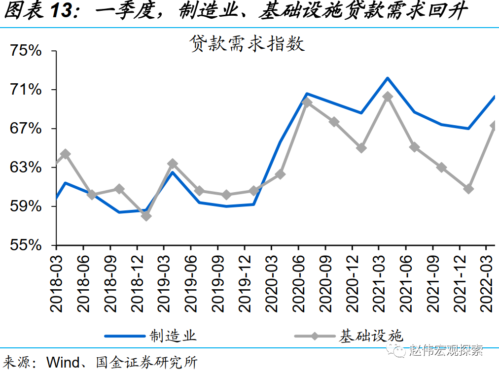 贷款分行业中,基础设施一季度需求超季节性高增,制造业贷款需求延续改善。一季度制造业、基础设施贷款需求指数回升,尤其是基础设施环比抬升6.5个百分点、高于近3年同期的4.1个百分点。存量增速中,一季度基础设施和制造业中长贷增速虽较2021年底回落,但仍维持近年高位,分别为13.2%和29.5%。