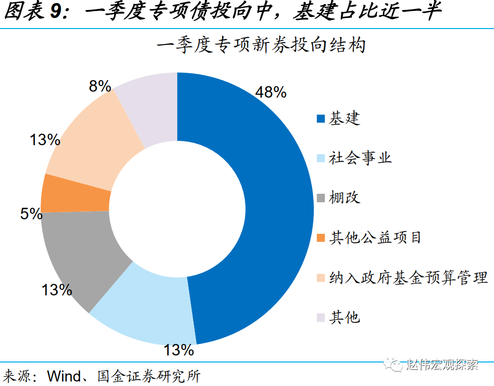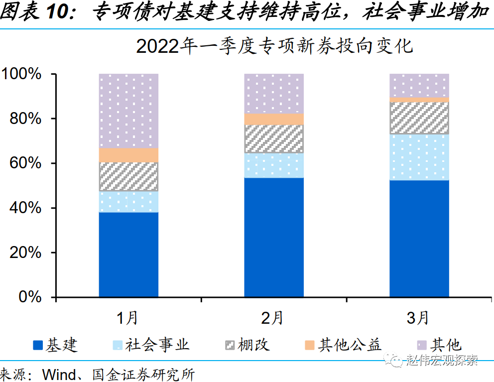 专项债对基建支持的比例抬升、单月一度达54%,对社会事业支持力度也在加大。一季度专项新券投向基建占比最大、48%,以民生医疗为代表社会事业占比居次、13.5%,棚改占比也较多、13.4%。动态来看,专项新券投向基建占比自1月的38%抬升至2月的54%、3月维持53%的高位;社会事业占比逐月抬升、3月一度达20.6%;棚改领域占比相对稳定、13%至14%间徘徊。