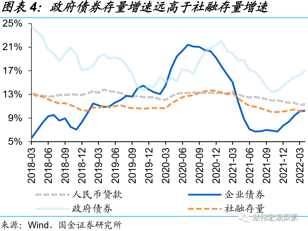一季度社融创新高,政府债券、人民币贷款等为主要贡献项。一季度新增社融达12万亿元、同比增长16.8%,创近年新高。分项中,政府债券同比多增9215亿元、贡献新增社融同比增量的53%,人民币贷款和企业债券同比增量居次,分别为4292亿元和4020亿元,带动社融存量增速企稳回升至10.6%、较2021年底抬升0.3个百分点。