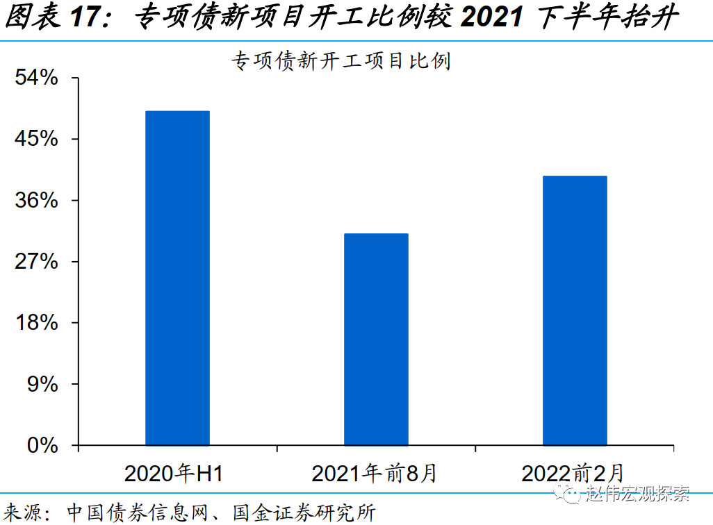 稳增长加码下,资金向基建等领域倾斜、为相关项目提供配套支持。新的下行压力加大下,稳增长诉求进一步升温,不断夯实政策底。地方债发行前置,信用债融资向基建等领域倾斜等,为稳增长提供资金支持。资金支持下,以重大项目为代表的基建、产业等项目,加快开工和施工,例如,前两个月,我们统计的近四千个专项债项目显示,新开工项目占比为38.4%、较去年底抬升8.4个百分点。