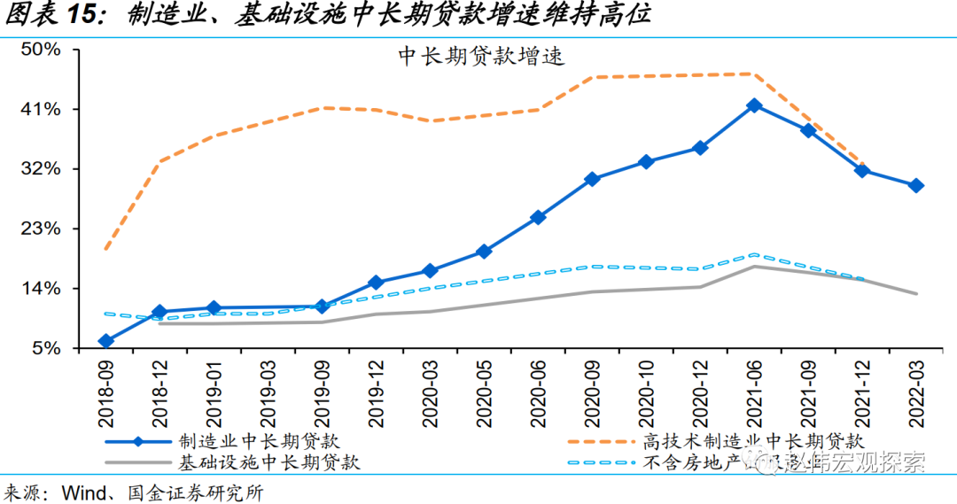 贷款分行业中,基础设施一季度需求超季节性高增,制造业贷款需求延续改善。一季度制造业、基础设施贷款需求指数回升,尤其是基础设施环比抬升6.5个百分点、明显高于近3年同期为4.1个百分点。从中长期贷款余额增速也可看出,一季度基础设施和制造业中长贷增速虽较2021年底均有回落,但依然维持近年高位,分别为13.2%和29.5%。