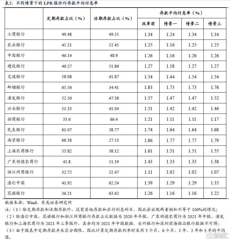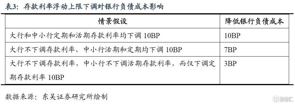 由于“鼓励中小银行存款利率浮动上限下调10个基点左右”并非强制,而是可以在银行宏观审慎评分(MPA)中有所加分,因此实际调降的幅度并不确定。在此我们分三个情景进行讨论:(1)情景一:大行和中小行定期和活期存款利率均下调10BP;(2)情景二:大行不下调存款利率,中小行活期和定期均下调10BP;(3)情景三:大行不下调存款利率,中小行不下调活期存款利率,而仅下调定期存款利率10BP。在这三种情景下,LPR报价行的负债成本可以分别下降约10BP、7BP和3BP。由于该下调提议主要针对中小银行,且大行的存款利率已经相对较低,定价下行弹性相对较小,因此情景一的可能性最低。同样,活期存款利率的下行空间有限,情景二的可能性次低。综上所述,在银行负债成本下行的可能性上,情景三>情景二>情景一。