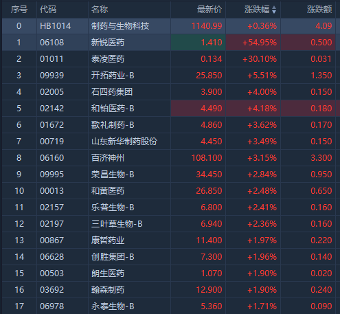 华盛资讯4月20日讯,港股医药股走高,新锐医药涨近60%,4月累计涨超1000%;泰凌医药涨超30%,开拓药业涨超4%,百济神州涨超3%,歌礼药业、药明生物、复星医药跟涨。