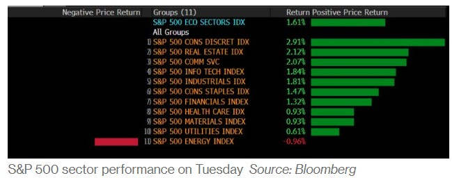 周二,标普500指数收涨1.6%,创下3月中旬以来的最大单日涨幅,也是七个交易日以来的第二次上涨。由小盘股组成的罗素2000指数在4月份表现最为强劲,上涨了2%。与此同时,标普500指数中对经济敏感的板块(包括非必需消费品和房地产)表现出色,只有能源板块收低。