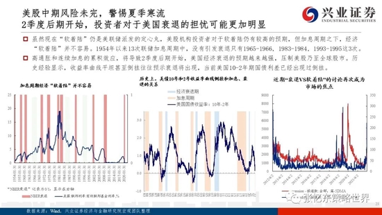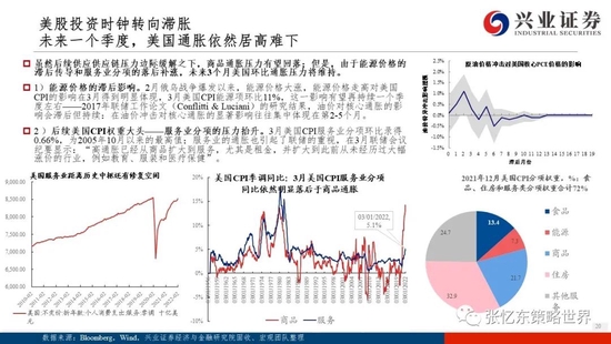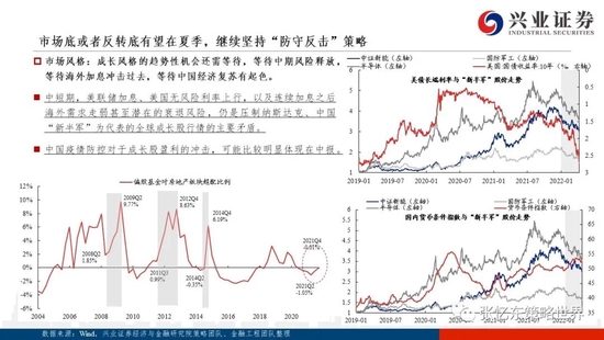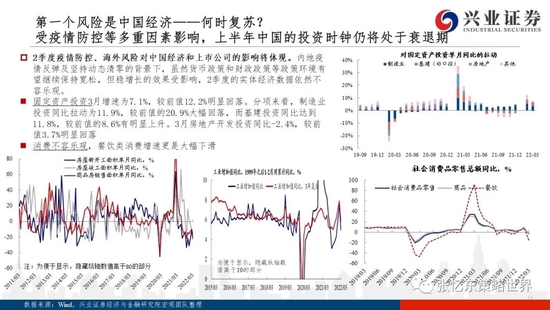 ——第二个风险是海外风险——美股中期风险未完,2季度后期或恶化,警惕美联储持续加息对新兴市场的影响。1)接下来,美股投资时钟转向滞胀:未来一个季度,美国通胀依然居高难下;叠加消费能力和消费意愿退潮,下半年商品消费动能难以持续;并且,5、6、7月美联储可能超级鹰派,美债收益率仍有上行空间。2)滞胀阶段,股市靠估值难有可为,EPS是收益的主要来源;;我们认为,整体而言,美股权重股盈利有韧性,大熊较难,但连续加息后,2季度后期开始,投资者对于美国衰退的担忧可能更加明显,压制美股乃至全球股市。此外也要警惕美联储加息和美股中期风险可能对新兴市场“殃及池鱼”。